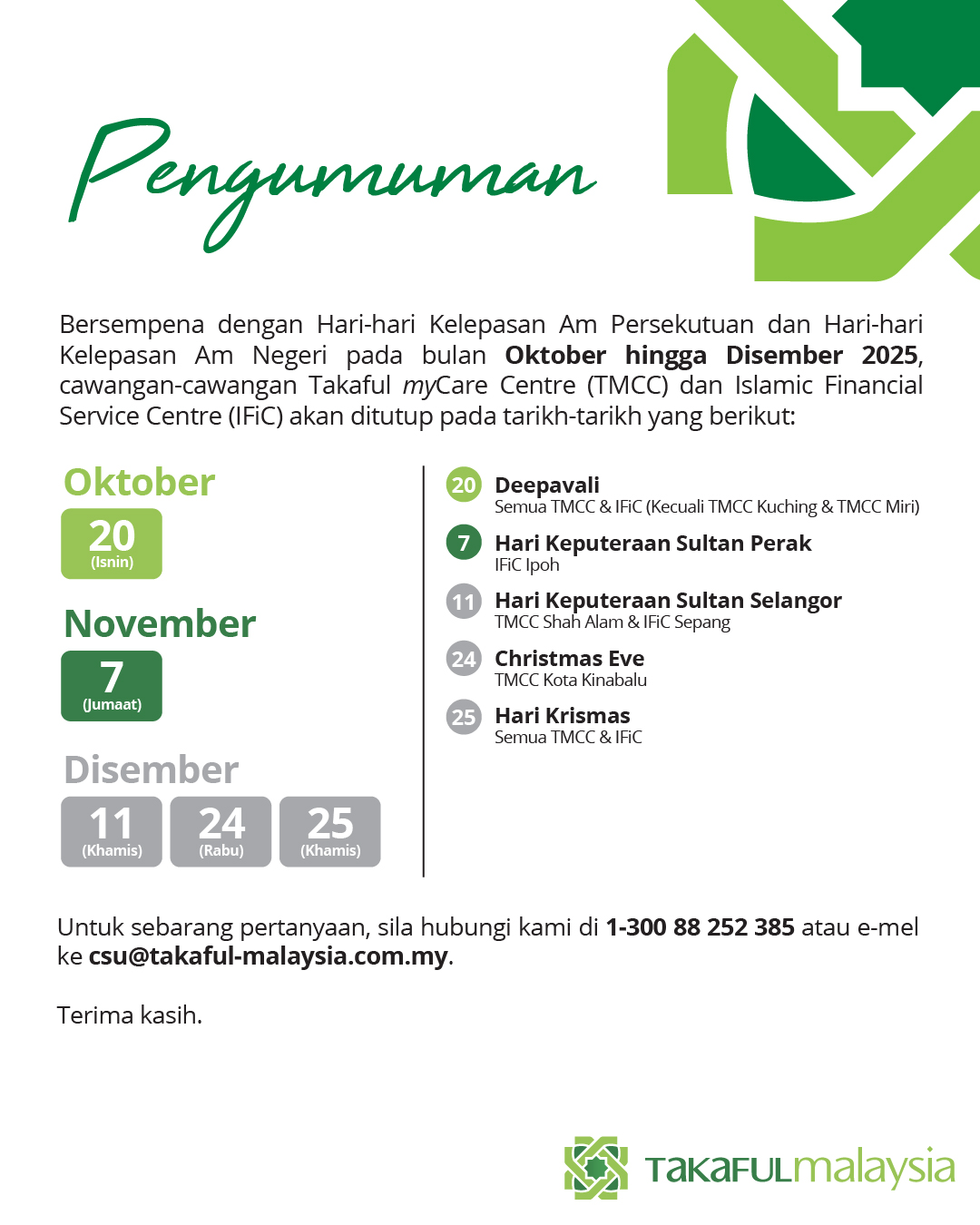 Bersempena dengan Hari-hari Kelepasan Am Persekutuan dan Hari-hari Kelepasan Am Negeri pada bulan Oktober hingga Disember 2025, cawangan-cawangan Takaful myCare Centre (TMCC) dan Islamic Financial Service Centre (IFiC) akan ditutup pada tarikh-tarikh yang berikut: