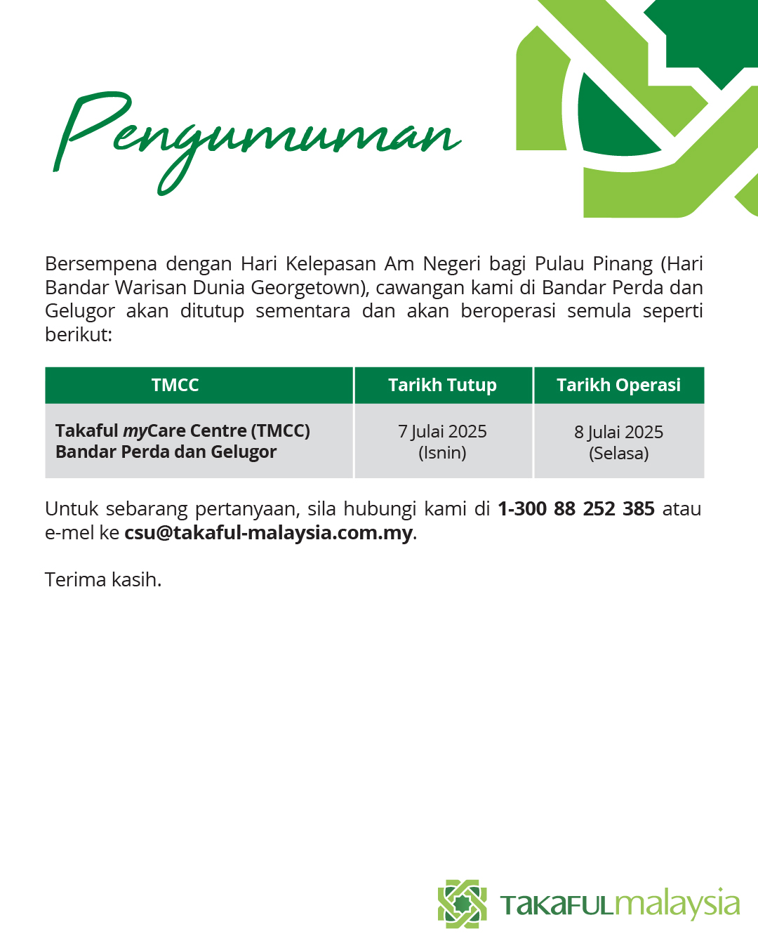 Bersempena Hari Kelepasan Am Negeri bagi Pulau Pinang (Hari Bandar Warisan Dunia Georgetown), cawangan kami di Bandar Perda dan Gelugor akan ditutup sementara dan akan beroperasi semula seperti berikut: