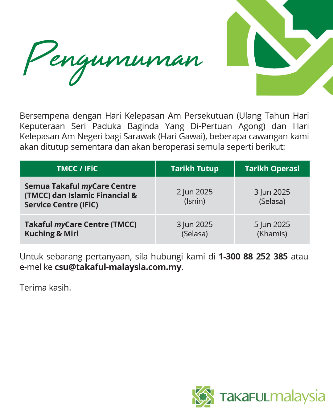 Bersempena Hari Kelepasan Am Persekutuan (Ulang Tahun Hari Keputeraan Seri Paduka Baginda Yang Di-Pertuan Agong) dan Hari Kelepasan Am Negeri bagi Sarawak (Hari Gawai), beberapa cawangan kami akan ditutup sementara dan akan beroperasi semula seperti berikut: